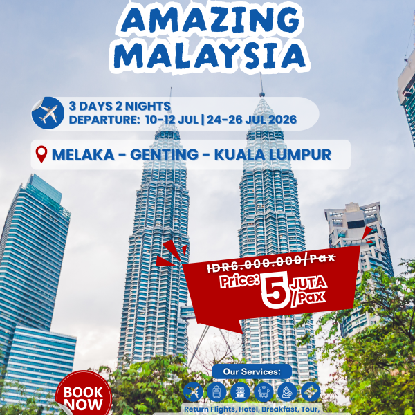 Sarapan dan check-out hotel di KUALA LUMPUR. Hari ini akan City Tour KUALA LUMPUR, diantaranya berkunjung ke ISTANA NEGARA, DATARAN MERDEKA, PETRONAS TWIN TOWER dan CENTRAL MARKET. Menuju Bandara, kembali ke JAKARTA, tour berakhir dan sampai jumpa! 😊